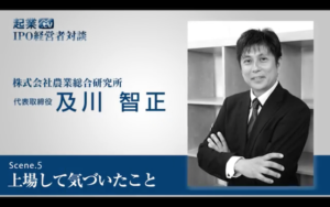 IPOまでの道のり 【IPO経営者対談】農業総合研究所・及川智正×スマートバリュー・渋谷順⑤ 2016年9月1日 今回のインタビューは、株式会社農業総合研究所 代表取締役社長 及川智正氏に、「農業で上場すること」「上場して変わったこと」「視聴者へのメッセージ」についてお話を伺いました。 農業だって上場できる 渋谷:先ほども、上場をべつに目指していたわけではなかったというお話もありましたが、これからどんどん広げていこうとすると、資...起業tv編集部