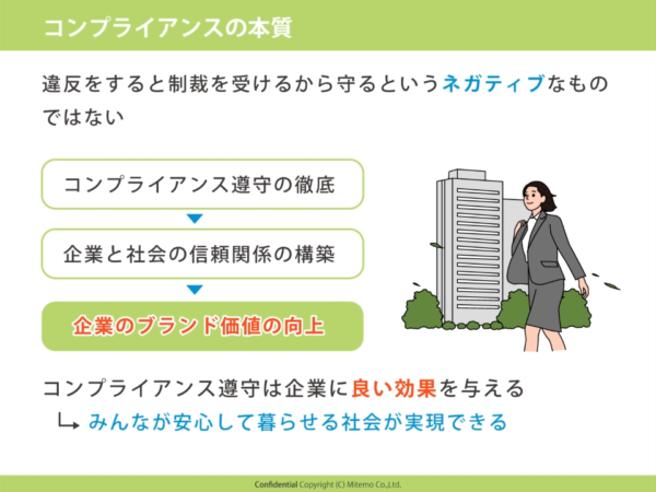 “「これはダメ、あれもダメ」と言うだけでなく、なぜ違反をしてはいけないのか、さらには法令を遵守することのメリットも説明”されています。