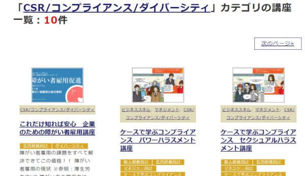 「CSR/コンプライアンス/ダイバーシティ」をテーマに10講座が提供されています。