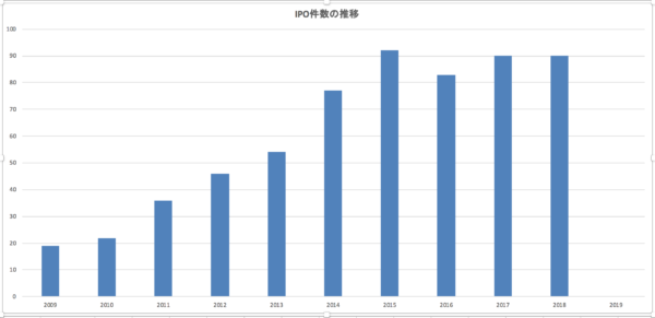一方、日本のIPOはどうでしょうか?グラフは2009年から2018年までのIPO件数の推移です。2009年から2015年までは増加傾向にありますが、2015年以降はほぼ横ばいです。今年も上期のIPOは38社なので、おそらく前年と同水準となるでしょう。