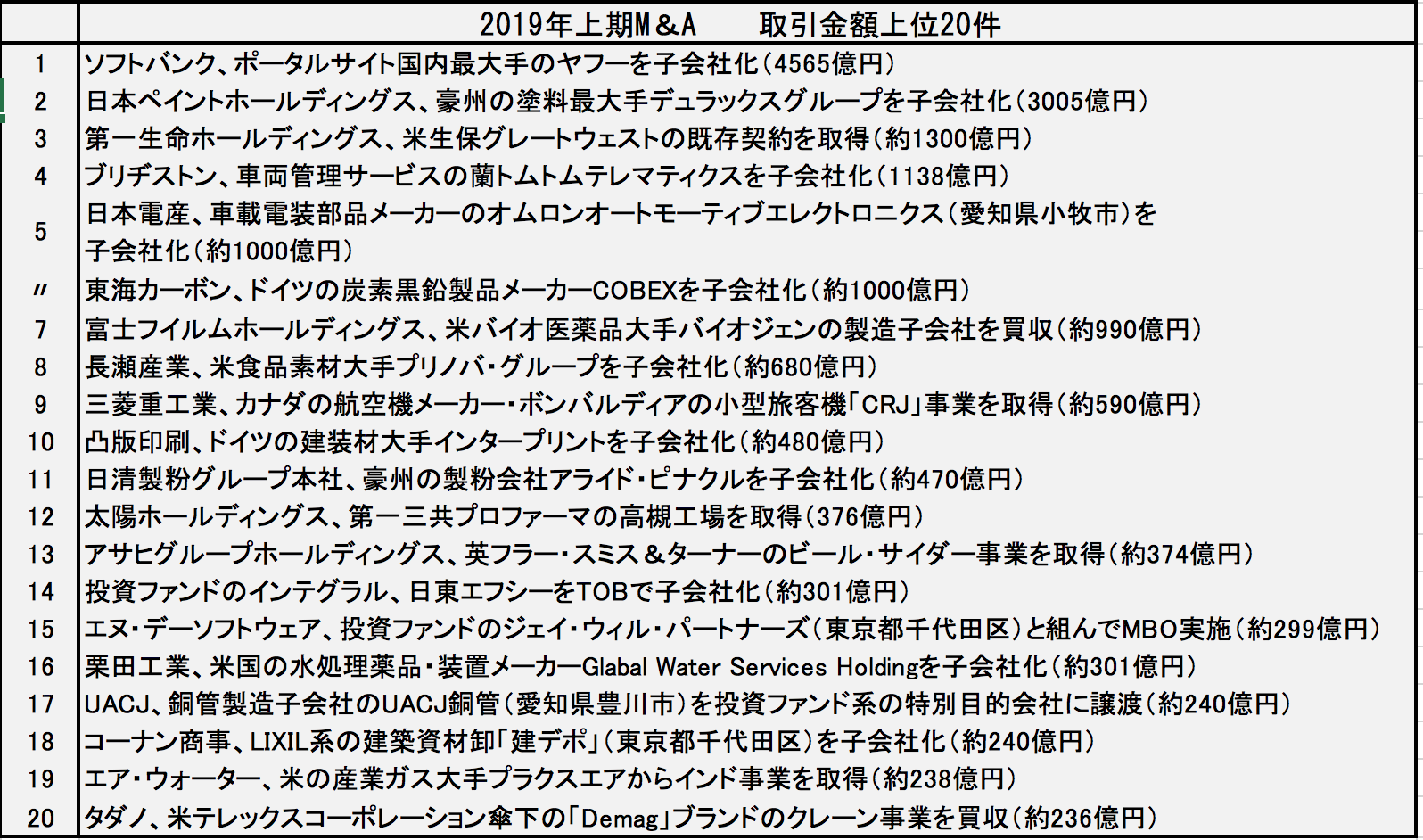 この表は2019年上期に実施されたM&Aの取引金額が大きかった上位20件をまとめたものです。上期の取引金額トップはポータルサイト国内最大手のヤフーの子会社化を発表したソフトバンクです。この買収はITと金融を融合したフィンテックなど非通信分野を強化するのが狙いとみられています。