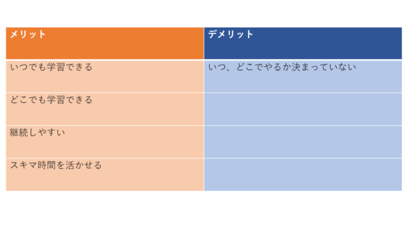 メリットは上の表のとおりです。場所・時間の限定がなくなり、どこでも・いつでも学習が可能になりました。また、すきま時間の有効活用により継続性も高まります。