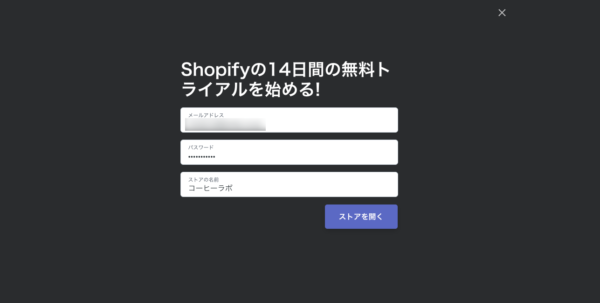 14日の無料トライアルを始めると出ますので、メールアドレス、パスワード、ストアの名前を入力しましょう。こちらは後で変更することでができます。