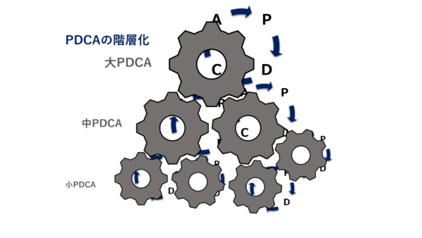 つまり、実際に回すのは小PDCAだけで、中PDCAや大PDCAは小さな歯車と連携して回っていくわけです。