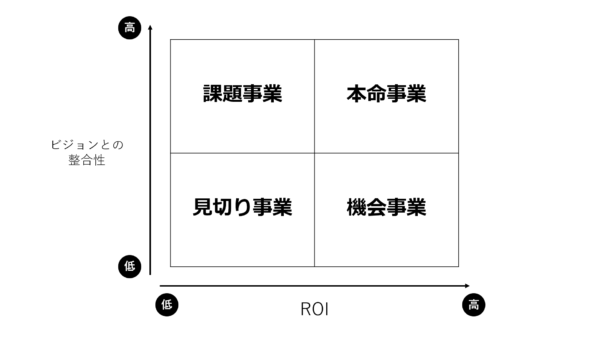 バリューポートフォリオの2つの軸「ビジョンとの整合性」「ROI」によって下図のような4象限が得られると思います。