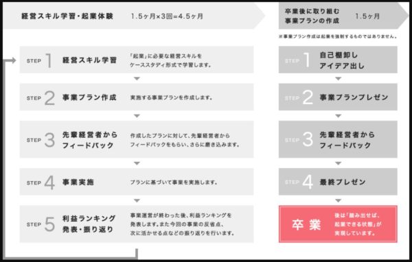 最初の4.5ヶ月が「経営スキル習得」と「起業体験」、最後の1.5ヶ月は卒業後、実際に取り組むビジネスの作成です。