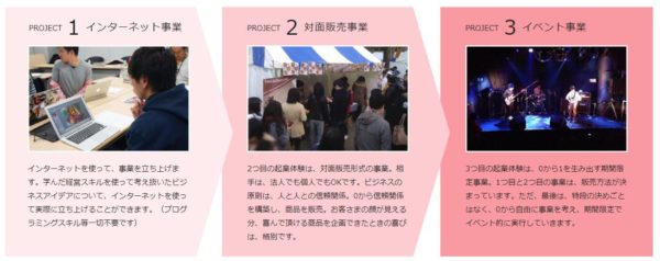 具体的なプロジェクトとして紹介されているのは「インターネット事業」「対面販売事業」「イベント事業」です。
